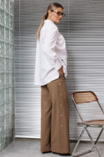 Брюки прямого широкого кроя гармонично дополняют рубашку, создавая стильный ансамбль. Сбоку расположенные лампасы с отделкой из пуговиц добавляют акцент и изысканность, а боковые карманы делают модель функциональной. Застежка в среднем шве и притачной пояс с резинкой сзади обеспечивают комфортную посадку и удобство в носке.