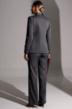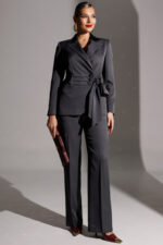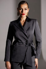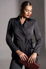 Жакет полуприлегающего силуэта с двухбортной застежкой на три обтяжные из атласной ткани пуговицы и одной потайной. Край борта овальной формы, что придаёт жакету утонченность. По переду  обработаны фигурные рельефы из проймы, также имеется горизонтальный подрез, в котором расположены карманы. На правой центральной части полочки – три складки, параллельные  подрезу. Дополнительно с левой стороны завязывается атласный бант, что придает нарядность и особый шарм. Одна часть банта крепиться на пуговицу, другая в боковом шве. Спинка со средним швом и вертикальными рельефами из проймы. Воротник пиджачного типа из атласной ткани  с пикообразными лацканами. Рукава двухшовные, со шлицей в локтевом шве на одну пуговицу, также обтяжную из атласа. Жакет на подкладке. Брюки классические, со стрелками, с притачным поясом-сзади частично на резинке для удобства и комфортной посадки. На поясе имеются пять шлёвок. На передних половинках присутствуют карманы. Застёжка на молнию и пуговицу. Костюм выполнен из качественной костюмной ткани с отделкой из атласа.