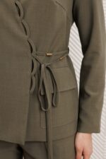 Линия плеча спущена, что добавляет расслабленности, а рукав рубашечного покроя обеспечивает комфорт. Особым элементом дизайна является шнур вокруг талии с металлической фурнитурой, который можно регулировать для создания идеальной посадки. Жакет также дополнен съемной брошью, что позволяет варьировать стиль. Внутренняя подкладка обеспечивает дополнительный комфорт.