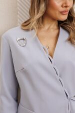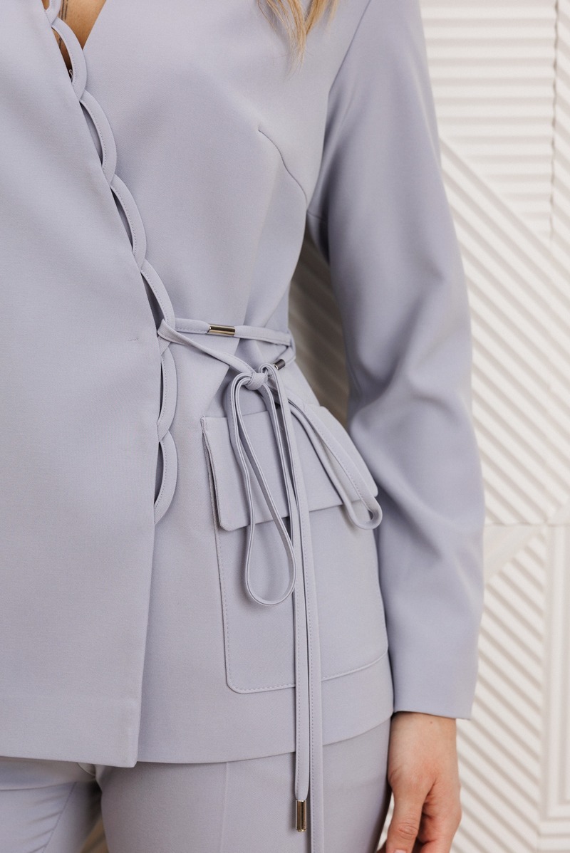 Линия плеча спущена, что добавляет расслабленности, а рукав рубашечного покроя обеспечивает комфорт. Особым элементом дизайна является шнур вокруг талии с металлической фурнитурой, который можно регулировать для создания идеальной посадки. Жакет также дополнен съемной брошью, что позволяет варьировать стиль. Внутренняя подкладка обеспечивает дополнительный комфорт.