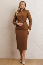 Юбка, длиной ниже колена, зауженная к низу. Застёжка в левом боковом шве на потайную молнию и пуговицу. На переднем и заднем полотнище юбки обработаны талевые вытачки, которые обеспечивают точную посадку по фигуре. Юбка на поясе, сзади частично на резинке для удобства и комфортной посадки. В среднем шве юбки обработана шлица, которая обеспечивает свободу движений. Юбка, также на подкладке.