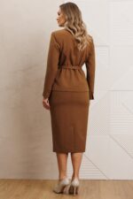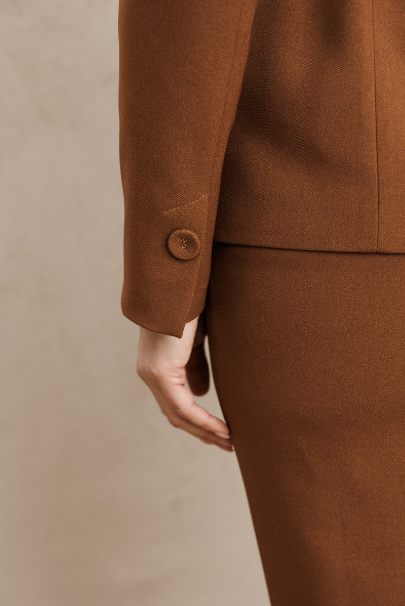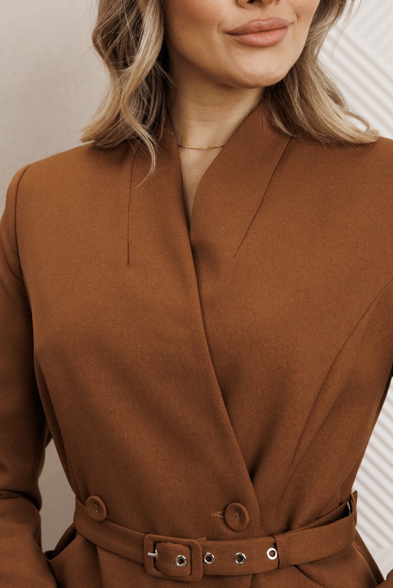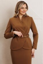 Жакет полуприлегающего силуэта с двухбортной застёжкой на одну пару обтяжных, из основной ткани, пуговиц и одной потайной. Край борта фигурной формы, придающей динамичность жакету. На полочке выполнены фигурные рельефы, которые дополнены функциональными карманами, гармонично вписывающимися в общую структуру изделия. Спинка со средним швом и вертикальными рельефами из проймы. Воротник с цельнокроенной стойкой, что придает жакету элегантный и строгий вид. Рукава двухшовные, со шлицей в локтевом шве на одну пуговицу, также обтяжную из основной ткани. Жакет дополнен шлёвками и съемным поясом из основной ткани с пятью блочками на обтяжную пряжку, чем придает дополнительный акцент на талии.