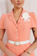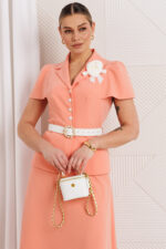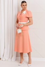 Двухпредметный комплект, состоящий из жакета и юбки. Жакет полуприлегающего силуэта, отрезной по линии талии. Перед и спинка с вертикальными рельефами, в которые вставлены рукава, сверху по окату со складками. Спинка со средним швом. Воротник пиджачного типа. Застежка на петли-пуговицы. Юбка А-силуэта, на притачном поясе, по бокам с резинками. Застежка на тесьму-молнию в среднем шве, который переходит в шлицу. Костюм на подкладке. Комплект декорирован съемной брошью в виде цветка.