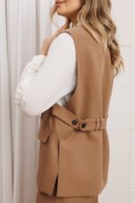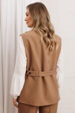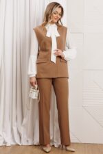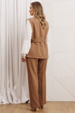 Костюм из серии нескучный офис» — это стильное решение для современных профессионалов, которые ценят комфорт и элегантность. Жилет женский из костюмной ткани свободного силуэта с центральной бортовой застёжкой на 3 пуговицы. Вырез горловины v- образной формы. По переду обработаны карманы в рамку с клапаном и вытачки. В шве отрезного бочка и спинки – шлицы. Спинка прямая, со средним швом. С левой стороны спинки настрочены две шлёвки, через которые протягивается пояс. С помощью петли и пары пуговиц на поясе можно регулировать приталенность жилета. Жилет на подкладке. Брюки прямые, с высокой посадкой, с заутюженными стрелками. Верхний срез брюк с притачным поясом. Брюки с застежкой на тесьму-молнию в среднем шве передних частей и застежкой на петлю-пуговицу по выступающим концам пояса. Передние части брюк с мягкими складками от верхнего среза, боковыми карманами, наклоненными к боковому шву.