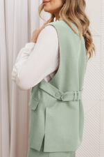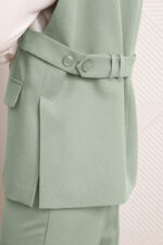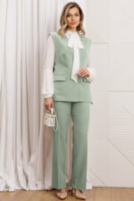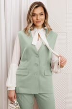 Костюм из серии нескучный офис» — это стильное решение для современных профессионалов, которые ценят комфорт и элегантность. Жилет женский из костюмной ткани свободного силуэта с центральной бортовой застёжкой на 3 пуговицы. Вырез горловины v- образной формы. По переду обработаны карманы в рамку с клапаном и вытачки. В шве отрезного бочка и спинки – шлицы. Спинка прямая, со средним швом. С левой стороны спинки настрочены две шлёвки, через которые протягивается пояс. С помощью петли и пары пуговиц на поясе можно регулировать приталенность жилета. Жилет на подкладке. Брюки прямые, с высокой посадкой, с заутюженными стрелками. Верхний срез брюк с притачным поясом. Брюки с застежкой на тесьму-молнию в среднем шве передних частей и застежкой на петлю-пуговицу по выступающим концам пояса. Передние части брюк с мягкими складками от верхнего среза, боковыми карманами, наклоненными к боковому шву.