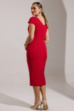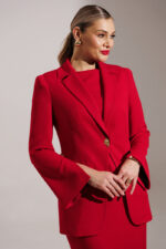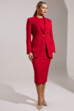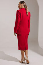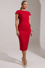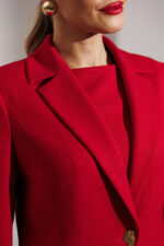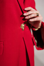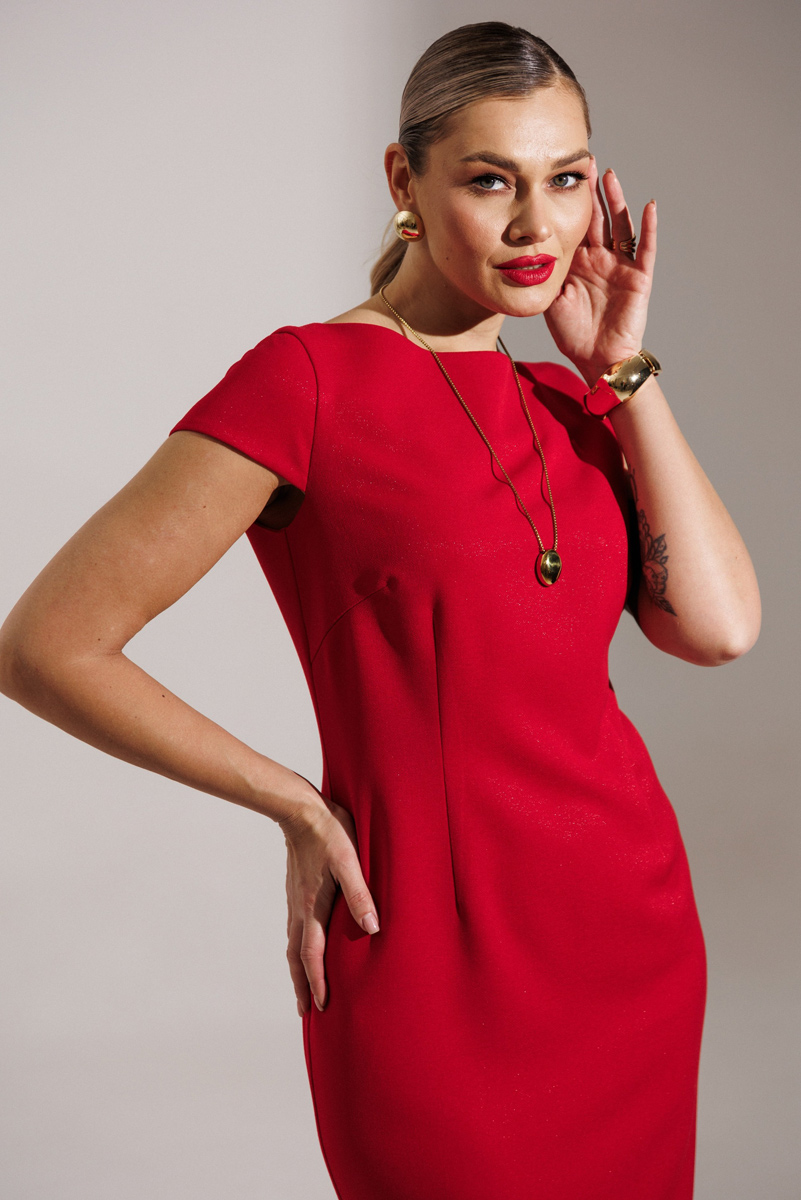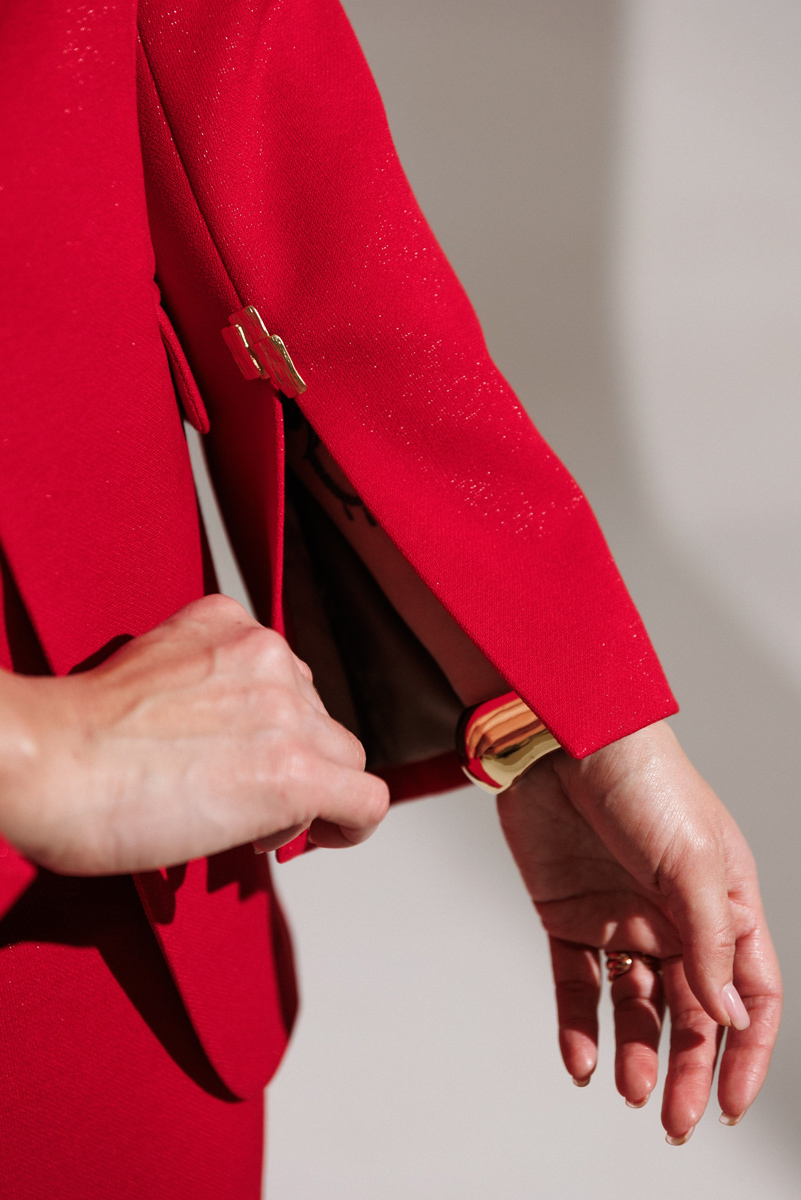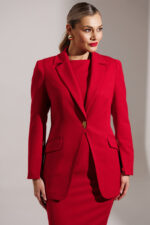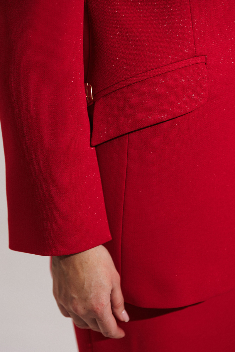 Нарядный комплект, состоящий из жакета и платья. Жакет – воплощение стильной трансформации. Его классический крой выполнен из безупречной трикотажной ткани, но в деталях скрывается своенравный характер. Жакет полуприлегающего силуэта. Модель отличается аккуратным кроем и стильными деталями. На передней части жакета обработаны вертикальные рельефы, идущие от проймы до уровня кармана и от кармана до низа, что придаёт силуэту выразительность и стройность. Воротник пиджачного типа добавляет классической элегантности. Застёжка центральная бортовая на петлю-пуговицу. Карманы в рамке с клапанами, гармонично расположены на передней части жакета. Спинка с центральным швом и вертикальными рельефами, идущими от проймы. Рукава двухшовные с отрезной деталью по окату и разрезами внизу добавляют свободы движению и делают модель более интересной. Жакет на подкладке. Платье женское приталенное из трикотажного полотна, длиной ниже колена. Рукава короткие – «крылышки». Вырез горловины спереди «лодочкой», сзади – V-образный. Платье приталено вытачками. В среднем шве спинки обработана шлица и потайная молния. Платье на подкладке.