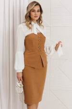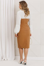 Этот нарядный костюм представляет собой элегантное и утонченное решение для особых случаев. Костюм состоит из корсета и юбки. Топ-корсет прилегающего силуэта с регилином по рельефам по переду и спинке, который обеспечивает дополнительную жёсткость и посадку на фигуре. Застёжка центральная бортовая на 6 петель и пуговиц. Низ переда фигурной заострённой формы, что подчёркивает элегантный силуэт. Модель идеально подходит для создания строгих, утонченных образов и может использоваться как в качестве элемента вечернего наряда, так и для повседневных образов с более нейтральными деталями. Наденьте его с нашей юбкой – это беспроигрышный дуэт, где игривость и строгость подчеркивают друг друга. Юбка прямая, зауженная к низу, сверху на притачном поясе. Застежка на тесьму-молнию в среднем шве, который переходит в шлицу. Костюм на подкладке.