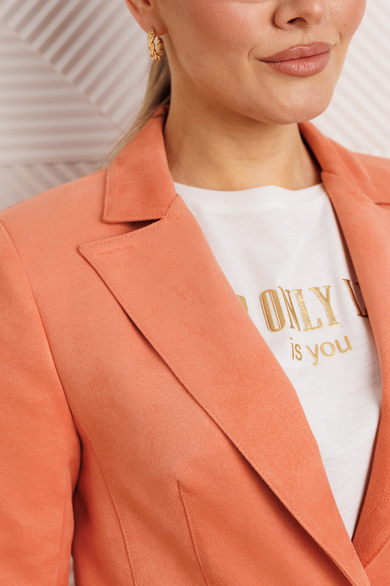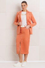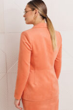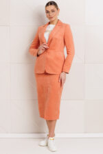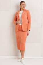 Представляем вам элегантный костюм, выполненный из благородной персиковой замши – материала, который дарит ощущение нежности и комфорта. Жакет однобортный, полуприлегающий. Застежка жакета на одну пуговицу, чуть выше линии талии. Рукав втачной, двухшовный. Воротник отложной с лацканами. На полочке прорезные карманы с листочкой. Длина жакета ниже линии бедер. Юбка миди – это не только модно, но и удобно. Она сочетает в себе стиль и комфорт, подходит для различных ситуаций и выглядит прекрасно на любой фигуре. Мы предлагаем прямую юбку-карандаш с разрезом. Разрез вносит шарм, романтичность и добавляет нотку эротичности женскому образу. Карманы придают спортивность. На задней половинке юбки – кокетка и средний шов. Застежка спереди на молнию. Верхний срез юбки обработан притачным поясом.