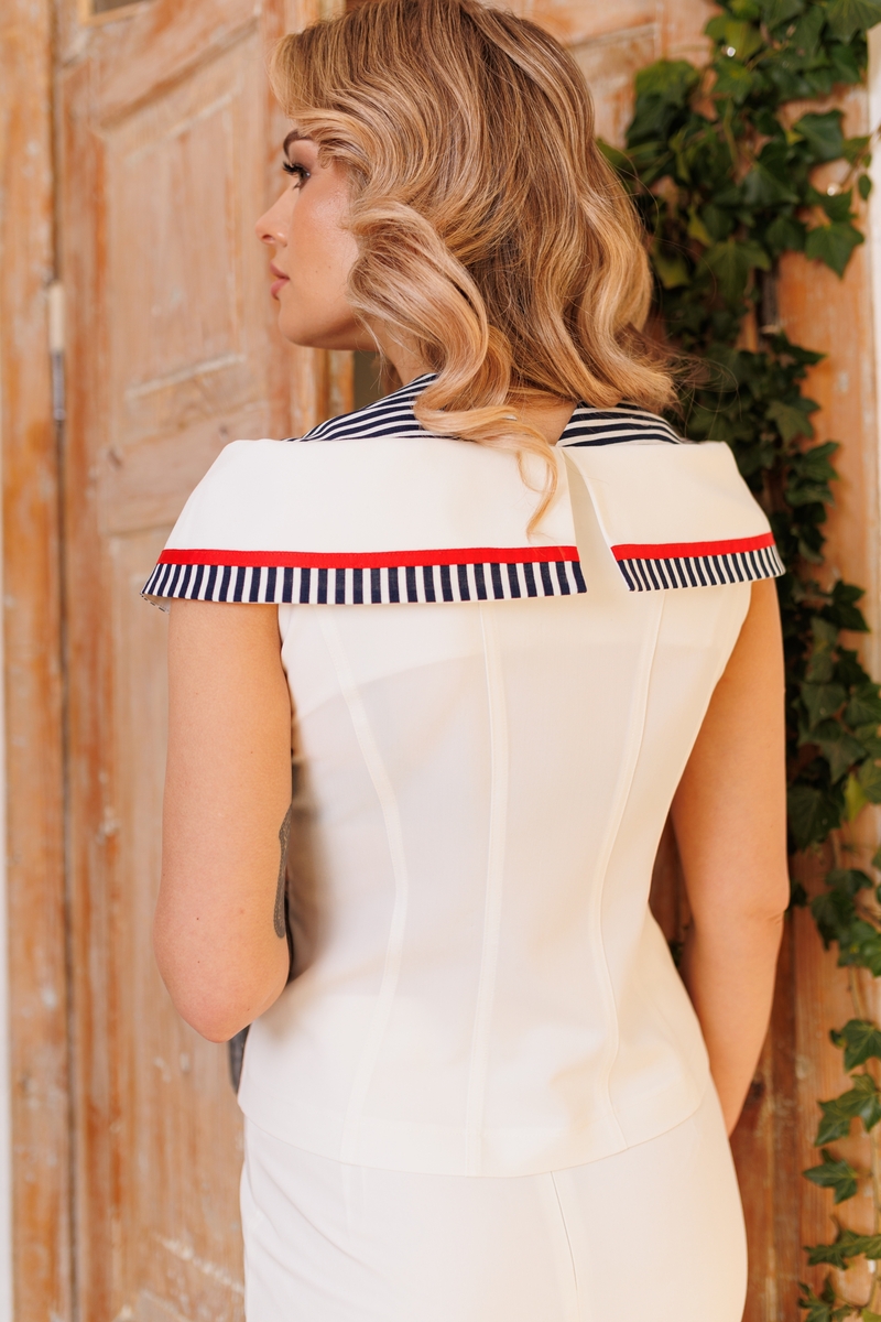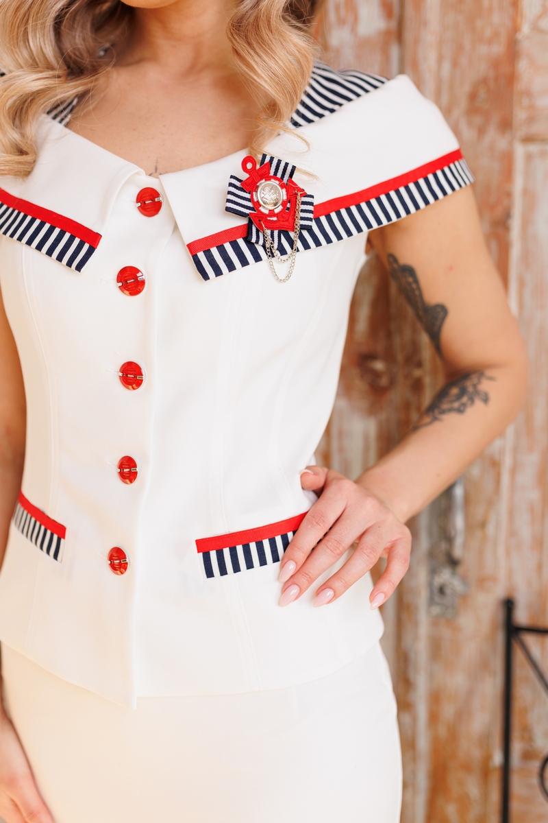 Хит этого лета – элегантный костюм в морском стиле, состоящий из двух предметов – жакета и юбки. Жакет прилегающего силуэта. По переду и спинке – вертикальные рельефы. Перед жакета украшают листочки. Воротник “фантазийный” с притачной планкой по нижнему краю. Полочка жакета на подкладке. Юбка прямая, зауженная к низу, на притачном поясе. Застежка на тесьму-молнию в среднем шве, который переходит в шлицу. Юбка на х/б подкладке.