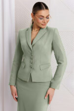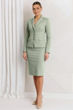 Стильный и элегантный костюм, состоящий из жакета и юбки. Жакет прилегающего силуэта выполнен по переду и спинке с рельефами, выходящими из проймы. На полочке обработаны карманы в рамку с клапаном. Спинка со средним швом. Рукав втачной двухшовный. Воротник пиджачного типа. Застежка центральная на петли с пуговицами. Юбка прямая, зауженная к низу, на притачном поясе с резинкой. Застежка на тесьму-молнию в среднем шве, который переходит в шлицу. Жакет и юбка на подкладке.