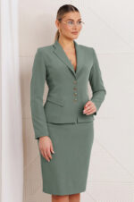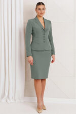 Стильный и элегантный костюм, состоящий из жакета и юбки. Жакет прилегающего силуэта выполнен по переду и спинке с рельефами, выходящими из проймы. На полочке обработаны карманы в рамку с клапаном. Спинка со средним швом. Рукав втачной двухшовный. Воротник пиджачного типа. Застежка центральная на петли с пуговицами. Юбка прямая, зауженная к низу, на притачном поясе с резинкой. Застежка на тесьму-молнию в среднем шве, который переходит в шлицу. Жакет и юбка на подкладке.