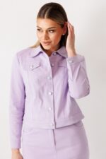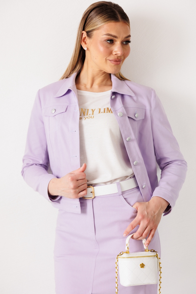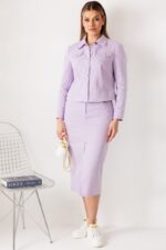 Комплект состоит из куртки и юбки, выполненных из джинсового полотна. Джинсовая юбка миди – это не только модно, но и удобно. Она сочетает в себе стиль и комфорт, подходит для различных ситуаций и выглядит прекрасно на любой фигуре. Мы предлагаем прямую юбку-карандаш с разрезом. Разрез вносит шарм, романтичность и добавляет нотку эротичности женскому образу. Карманы придают спортивность. На задней половинке юбки – кокетка и средний шов. Застежка спереди на молнию. Верхний срез юбки обработан притачным поясом. Куртка полуприлегающего силуэта. Полочка с отрезной кокеткой, рельефными швами от кокетки до низа куртки. Спинка с отрезной кокеткой и рельефными швами. По низу куртки идет притачная планка, которая на боковых швах украшена настрочными патами. Рукав втачной, двухшовный. Застежка центральная на петли-пуговицы. Рельефы кокетки, клапаны и воротник отстрочены двойной отделочной строчкой
