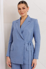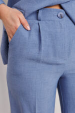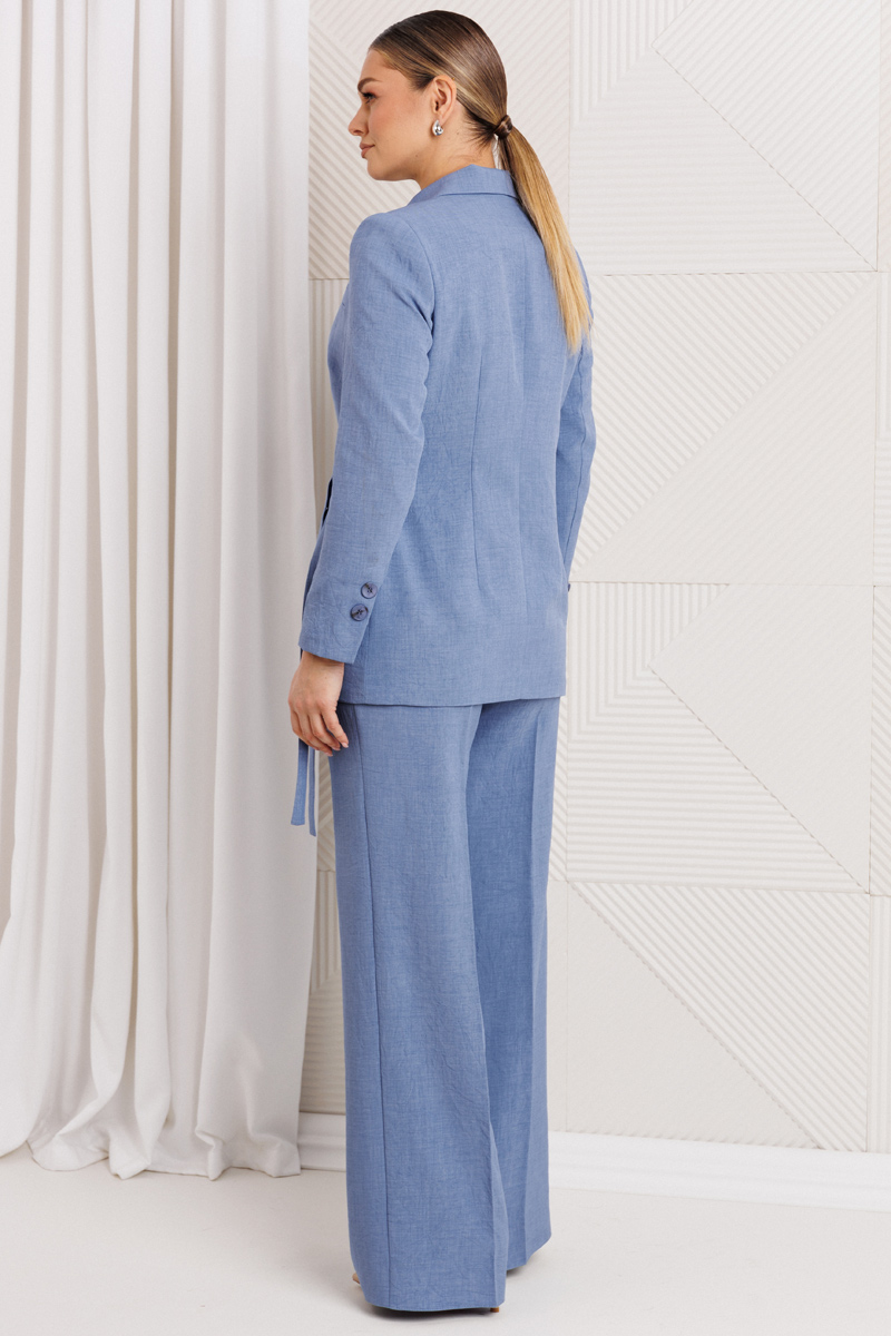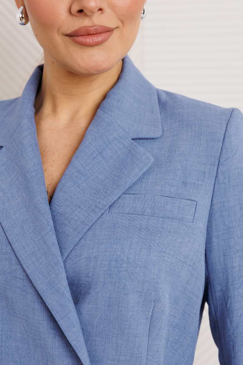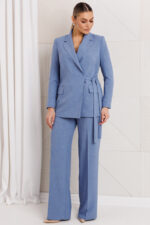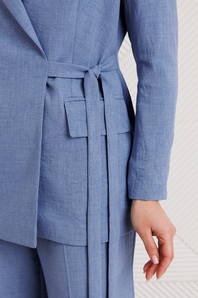 Женский трендовый костюм, состоящий из жакета и брюк. Жакет полуприлегающего силуэта, удлиненный, со смещенной бортовой застежкой на завязку и потайную пуговицу. По переду талиевые вытачки, выходящие от горизонтальных подрезов, в которых обработаны карманы в рамку с клапанами. На груди обработана листочка, имитирующая нагрудной карман. Спинка со средним швом и талиевыми вытачками. Рукав втачной, двухшовный, со шлицей. На шлицах по две декоративных пуговиц. Воротник пиджачного типа. Жакет на подкладке. Брюки на притачном поясе с резинкой, прямые, со складкой по талии и с заутюженными кантами. По бокам обработаны карманы. Брюки с завышенной талией, свободной формы, выгодно подчеркивают изящность ног и придают fashion-нотку образу. Удобная в носке ткань, хорошая посадка по фигуре, универсальность и лаконичность модели не оставят равнодушной ни одну женщину.
