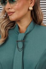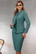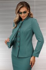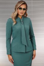 Комплект женский, состоящий из жакета и юбки. Жакет полуприлегающего силуэта с рельефами по переду и спинке. Спинка со средним швом. Рукав втачной, двухшовный. Воротник-стойка, переходящий в шарф. Юбка прямая, зауженная к низу, сверху на притачном поясе с резинкой. Застежка на тесьму-молнию в среднем шве, который переходит в шлицу. Костюм на подкладке. Главным декором и акцентом является съемная брошь.