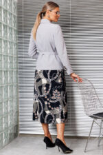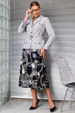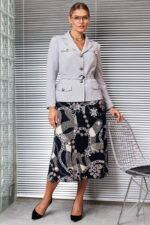 С жакетом отлично сочетаются брюки с заутюженными стрелками. Женственный и более официальный дуэт можно составить из жакета и классической юбки. Для создания романтического образа выбирайте атласную юбку – идеальный вариант. Мы предлагаем его в тандеме с юбкой А-образного силуэта, выполненной из мягкого струящегося трикотажного материала, который обеспечивает комфорт и свободу движений. Длина миди делает её универсальной для различных случаев — от повседневных до более нарядных.