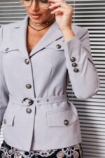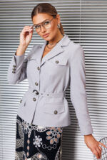 Жакет полуприлегающего силуэта с центральной застежкой на петли-пуговицы. Спинка со средним швом. По переду – талиевые вытачки, карманы с клапаном и декоративные клапаны в области груди. Воротник пиджачного типа. Рукава втачные, двухшовные. Локтевой шов заканчивается отлетной шлицей с декором из ряда пуговиц. Жакет на подкладке.