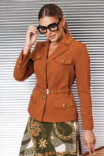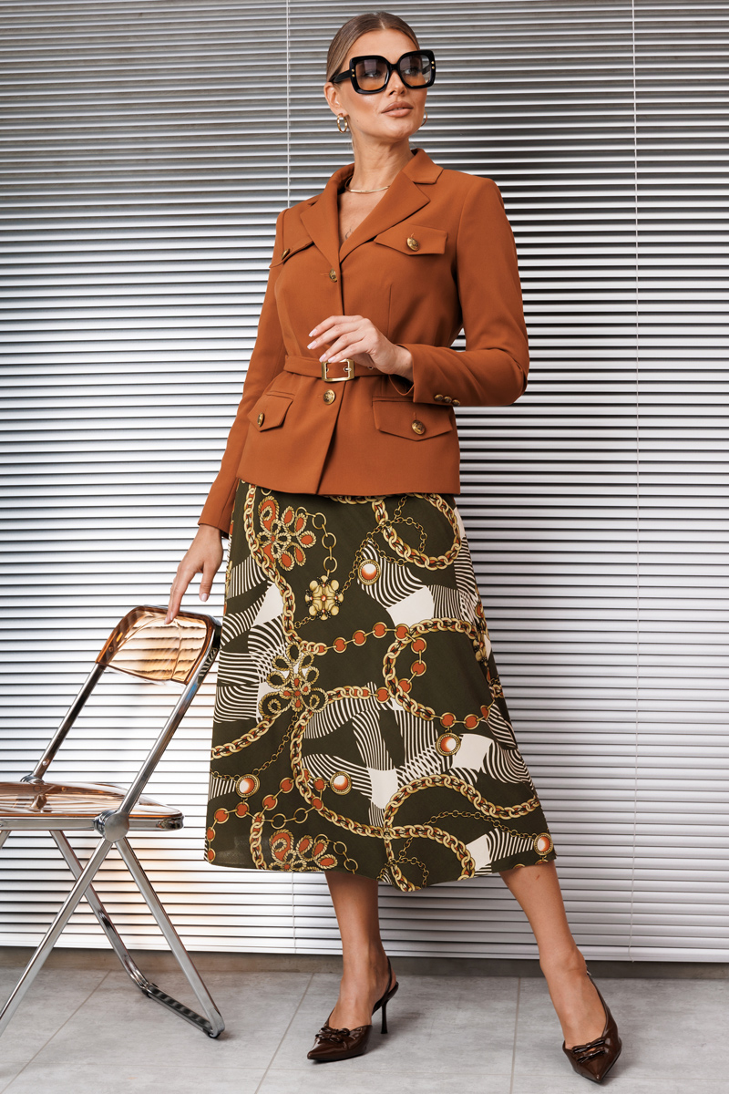 С жакетом отлично сочетаются брюки с заутюженными стрелками. Женственный и более официальный дуэт можно составить из жакета и классической юбки. Для создания романтического образа выбирайте атласную юбку – идеальный вариант. Мы предлагаем его в тандеме с юбкой А-образного силуэта, выполненной из мягкого струящегося трикотажного материала, который обеспечивает комфорт и свободу движений. Длина миди делает её универсальной для различных случаев — от повседневных до более нарядных.