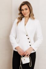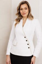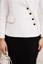 Женский комплект, состоящий из жакета и юбки. Жакет полуприлегающего силуэта со спущенной застежкой на четыре пуговицы. Жакет с отрезной баской и клапаном по линии притачивания баски. По спинке средний шов и талиевые вытачки, по переду отрезные бочки. Край борта и клапана украшен декоративной тесьмой в виде цепи. Юбка прямая, зауженная к низу, сверху на притачном поясе. Юбка прямая, зауженная к низу, сверху на притачном поясе. Застежка на тесьму-молнию в среднем шве, который переходит в шлицу. Костюм на подкладке.