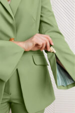 Деловой комплект, состоящий из жакета и брюк. Жакет – воплощение стильной трансформации. Его классический крой выполнен из безупречной костюмной ткани, но в деталях скрывается своенравный характер. Жакет полуприлегающего силуэта. Модель отличается аккуратным кроем и стильными деталями. На передней части жакета обработаны вертикальные рельефы, идущие от проймы до уровня кармана и от кармана до низа, что придаёт силуэту выразительность и стройность. Воротник пиджачного типа добавляет классической элегантности. Застёжка центральная бортовая на петлю-пуговицу. Карманы в рамке с клапанами, гармонично расположены на передней части жакета. Спинка с центральным швом и вертикальными рельефами, идущими от проймы. Рукава двухшовные с отрезной деталью по окату и разрезами внизу добавляют свободы движению и делают модель более интересной. Жакет на подкладке. Брюки с высокой посадкой, по линии талии – притачной пояс, в боковых швах резинка. Застежка на молнию.
