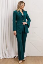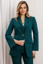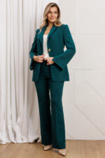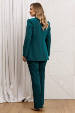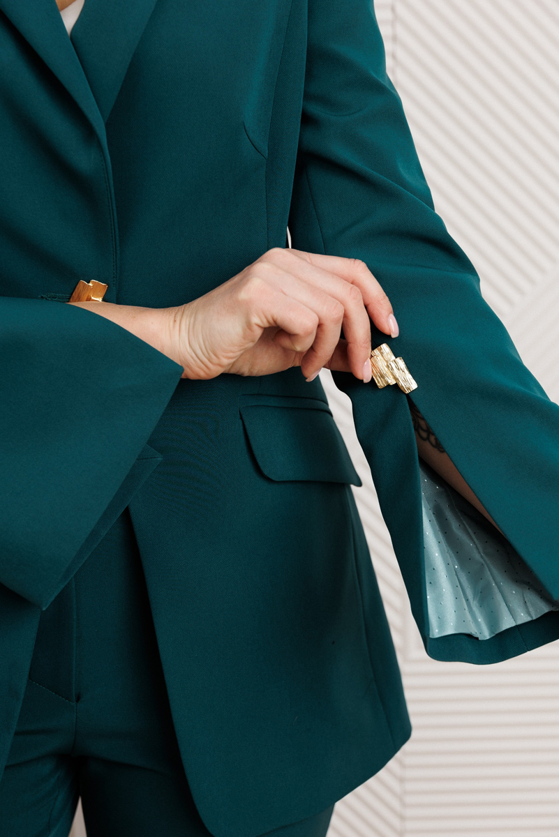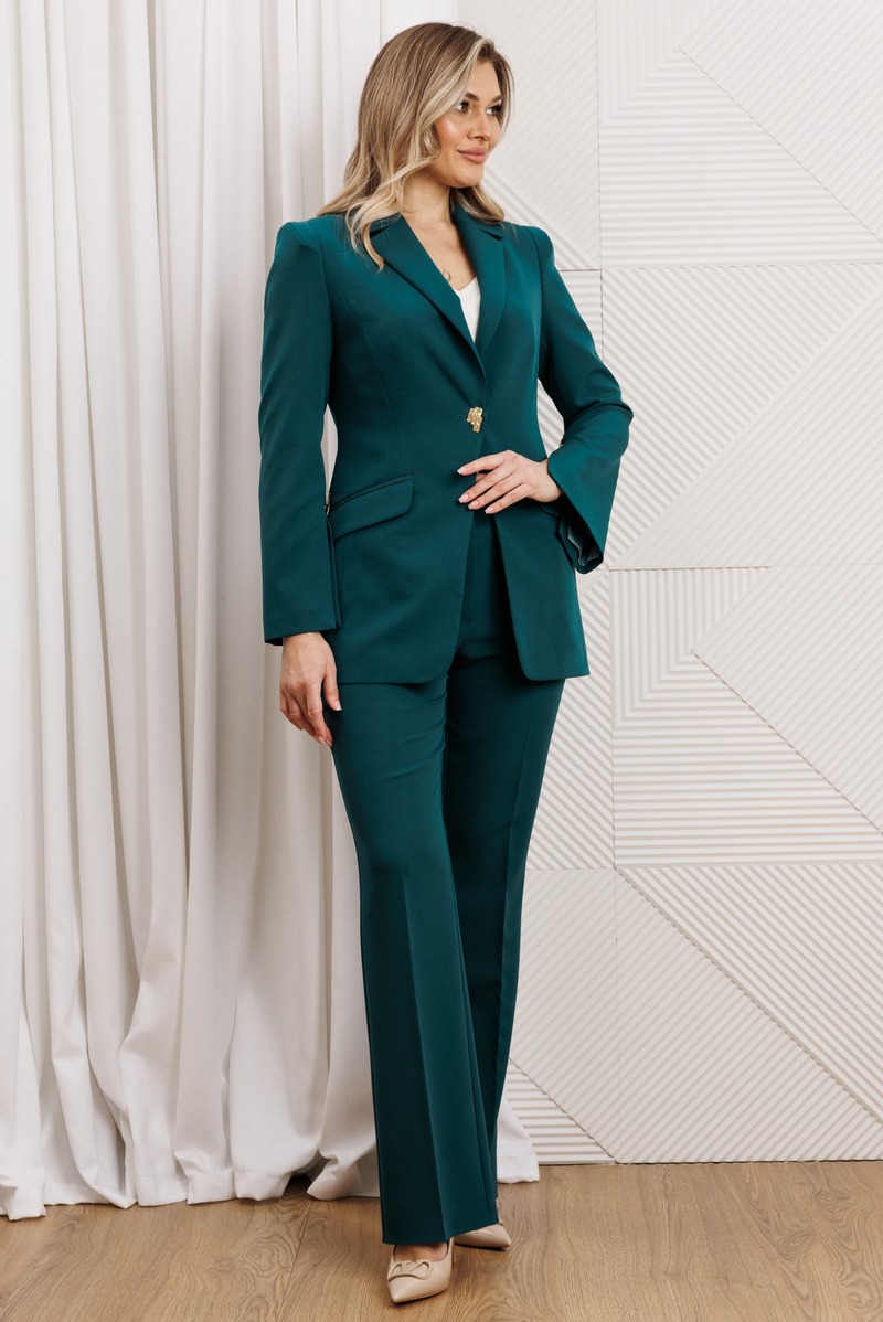 Деловой комплект, состоящий из жакета и брюк. Жакет – воплощение стильной трансформации. Его классический крой выполнен из безупречной костюмной ткани, но в деталях скрывается своенравный характер. Жакет полуприлегающего силуэта. Модель отличается аккуратным кроем и стильными деталями. На передней части жакета обработаны вертикальные рельефы, идущие от проймы до уровня кармана и от кармана до низа, что придаёт силуэту выразительность и стройность. Воротник пиджачного типа добавляет классической элегантности. Застёжка центральная бортовая на петлю-пуговицу. Карманы в рамке с клапанами, гармонично расположены на передней части жакета. Спинка с центральным швом и вертикальными рельефами, идущими от проймы. Рукава двухшовные с отрезной деталью по окату и разрезами внизу добавляют свободы движению и делают модель более интересной. Жакет на подкладке. Брюки с высокой посадкой, по линии талии – притачной пояс, в боковых швах резинка. Застежка на молнию.