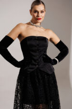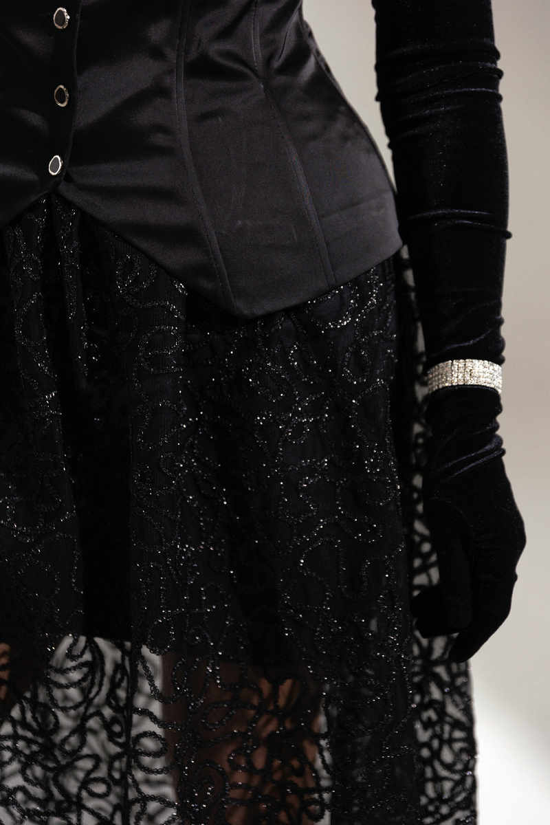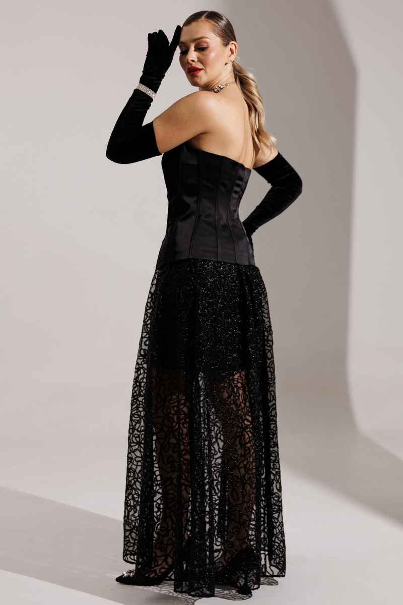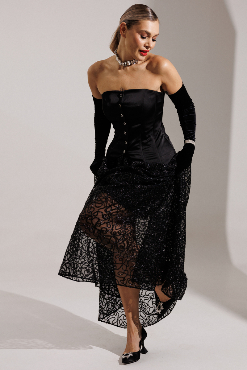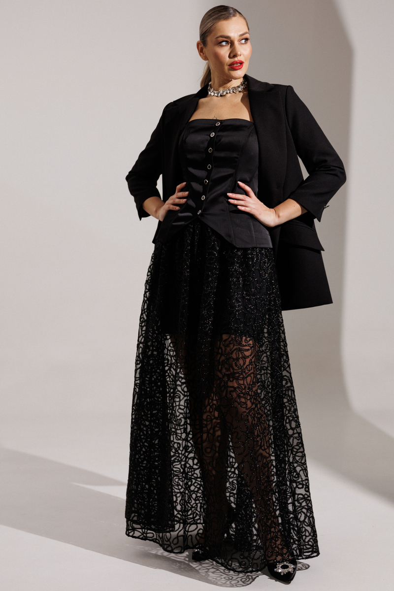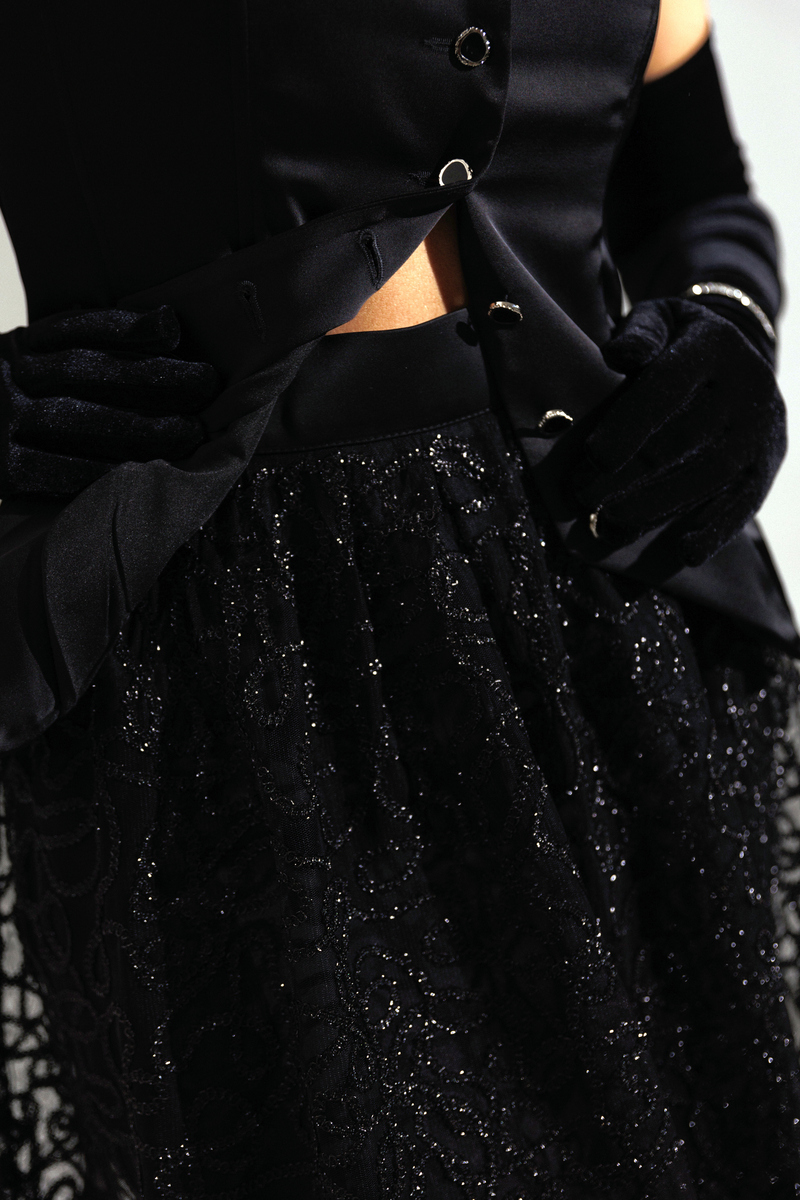 Хотите образ, который соберет все восторженные взгляды? Не ищите дальше! Встречайте главную героиню новогодней ночи! Юбка, которая состоит из двух слоев: нижняя часть зауженная мини, а верхняя — длинная, пышная. Верхний слой выполнен из черной сетки, расшитой декоративной тесьмой.  Притачной пояс и молния сзади завершают образ. Вы выглядите безупречно и чувствуете себя уверенно в любом движении! Завершите образ с помощью корсета из нашей новогодней коллекции. В дуэте они раскрываются на все 100%: баланс пышности низа и собранного верха. Ваш готовый билет на самый стильный Новый год!